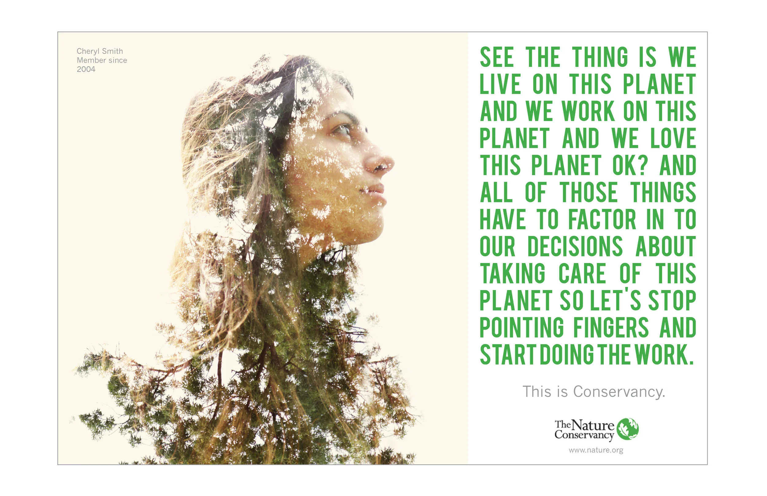 By landing on what this word means, how it is the core of an enduring mission, and pairing that ownership with illustrating it through the lives of members (effectively walking the walk), Nature Conservancy would have a differentiating story in the sector.